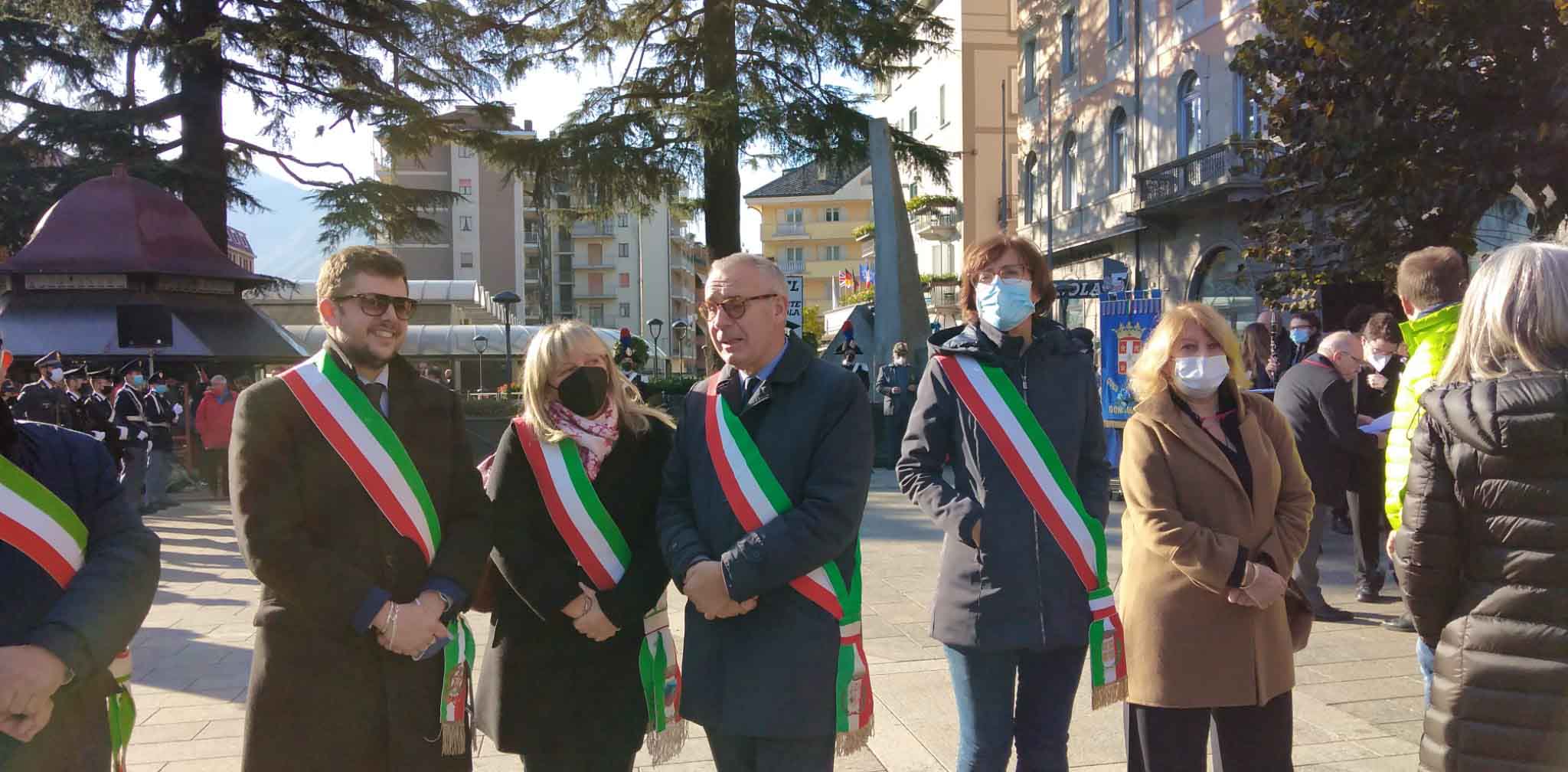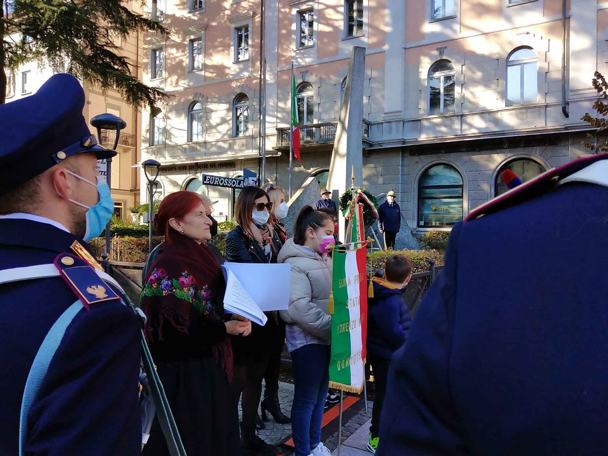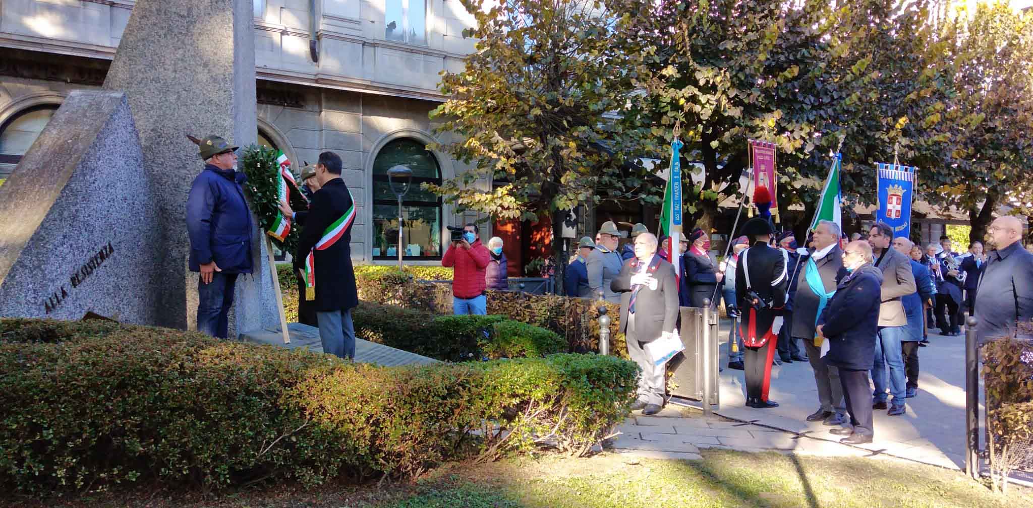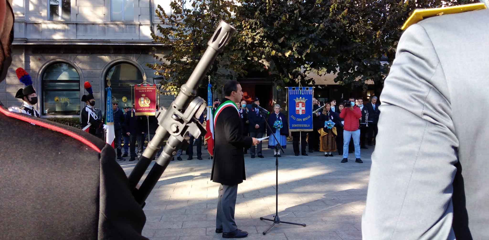 DOMODOSSOLA- 24-110-2021-- Cerimonia di celebrazione del 77° anniversario della Repubblica partigiana dell’Ossola presso il monumento alla Resistenza di piazza Matteotti con il ricevimento e gli onori al gonfalone della città, decorata con medaglia d’oro al valor militare. Dopo l’alzabandiera la deposizione della corona d’alloro