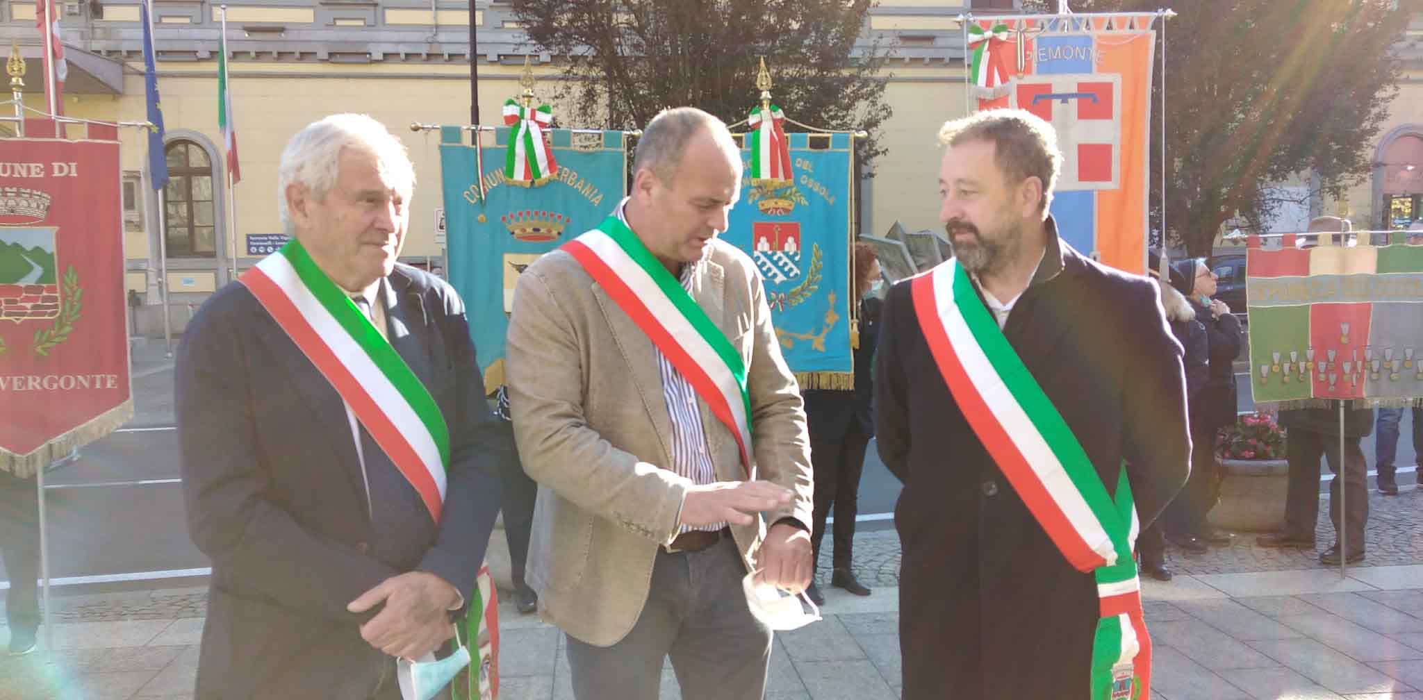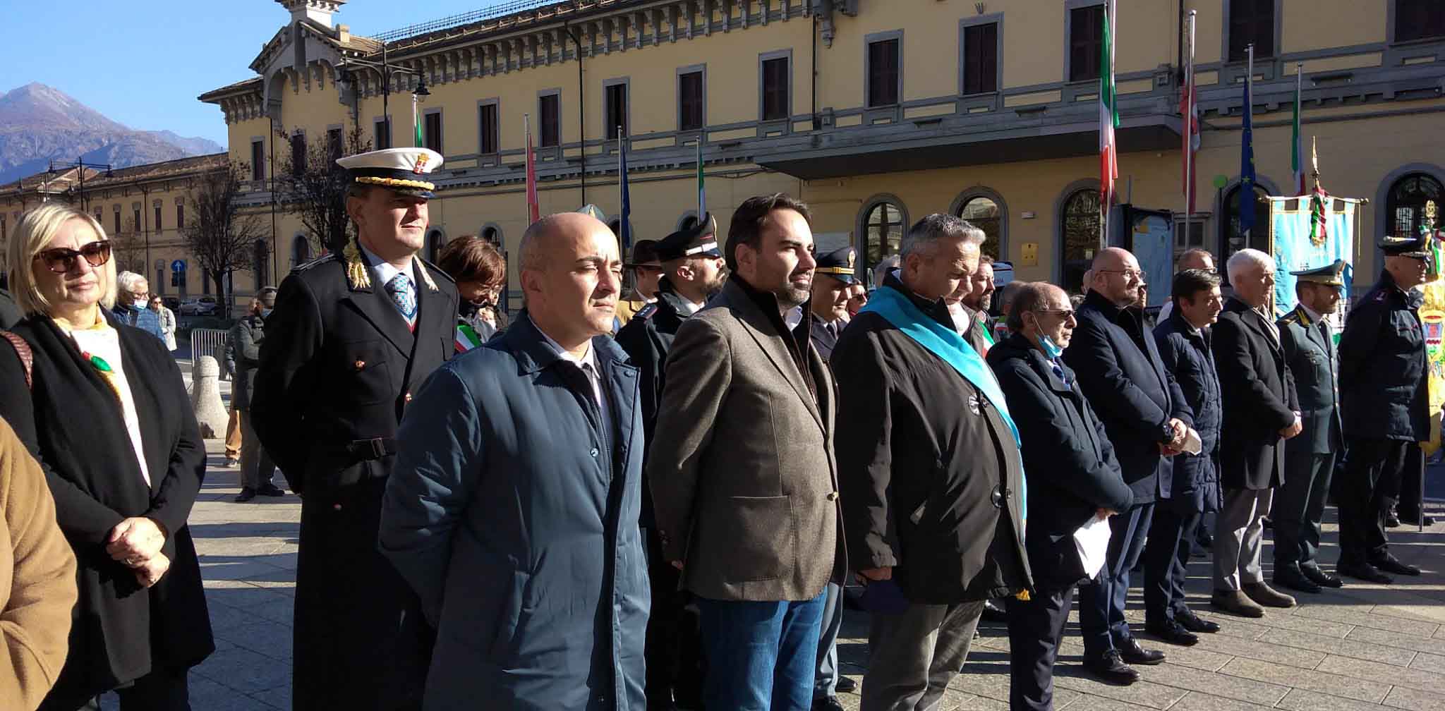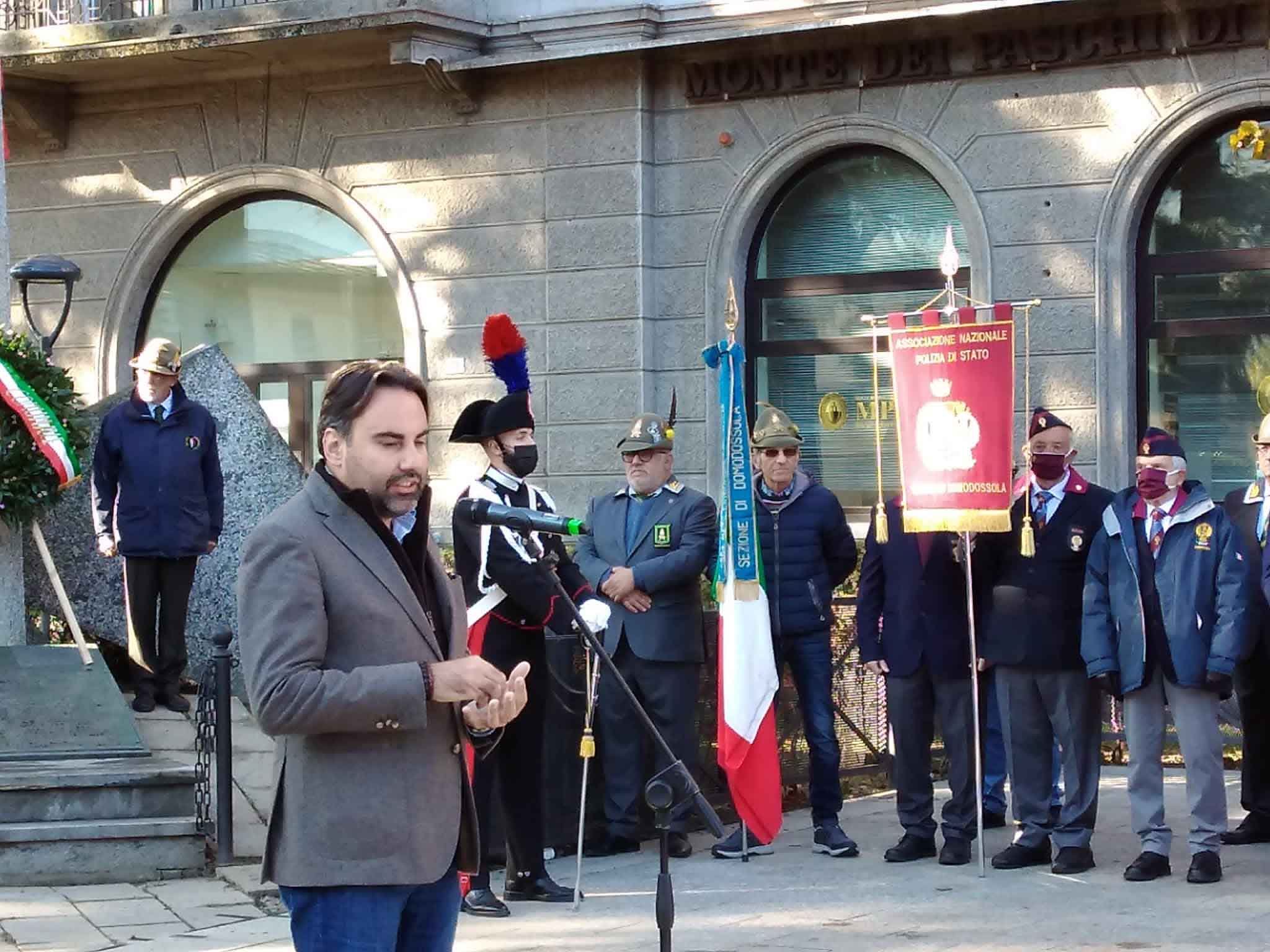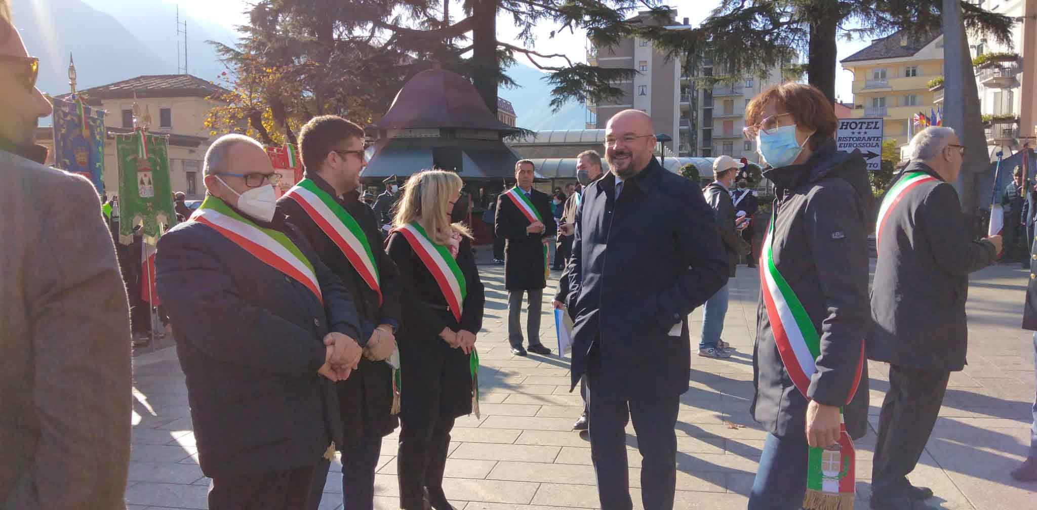 DOMODOSSOLA- 24-110-2021-- Cerimonia di celebrazione del 77° anniversario della Repubblica partigiana dell’Ossola presso il monumento alla Resistenza di piazza Matteotti con il ricevimento e gli onori al gonfalone della città, decorata con medaglia d’oro al valor militare. Dopo l’alzabandiera la deposizione della corona d’alloro