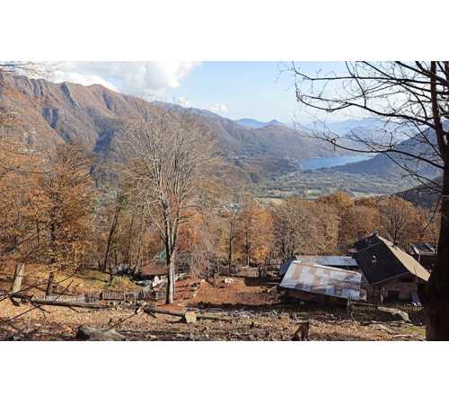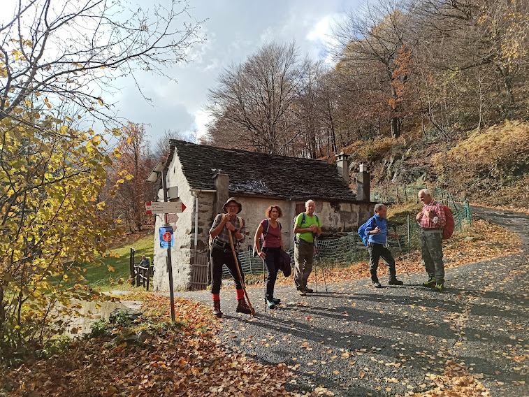 Incontriamo un piccolo monumento a tre ragazzi di vent’anni che morirono qui per la loro patria nel 1945. Troviamo anche una galleria. Attraversiamo una leggera nebbia e ne usciamo ad incontrare i primi sprazzi di sole. Dopo un’ora e mezza raggiungiamo l’Alpe La Solitudine, 835. All’Alpe Barumboda, 975, dopo un’altra mezz’ora, lasciamo la mulattiera e seguiamo verso sud una pista, lungo la quale incrociamo una piccola condotta forzata, traccia della presenza, anche qui, dell’Homo Idroelettricus.
