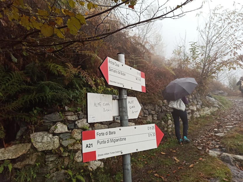 Sulla pista pianeggiante, con gli ombrelli aperti per ripararci dalle ultime gocce di pioggia, ci dirigiamo verso il Forte di Bara, a nord. Qualche salamandra si gode l’umidità. Pochi minuti prima di arrivarci incrociamo la Strada Cadorna, che è una meravigliosa mulattiera in perfetto stato di conservazione. Teniamo la sinistra ed iniziamo a salire lungo la perfetta, costante pendenza, tipica delle vere mulattiere.
