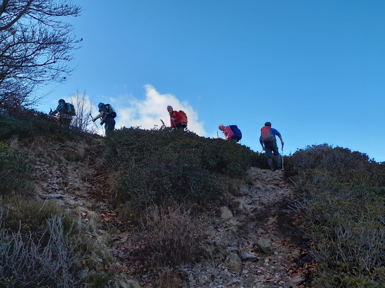 Dal piazzale imbocchiamo una pista che sale verso destra ed effettua, quasi in piano, un semiperiplo del Monte Spalavera. A Pian d’Alpe, 1320, iniziamo a risalire, quasi in presa diretta, il versante nord su bel sentiero e, dopo un’ora da Colle, siamo in vetta, 1534. Il panorama è stupendo, la sosta breve, la vetta già “occupata” e l’aria frizzante. A sud nebbie vaganti, qui il sole non ci tradisce, per ora.