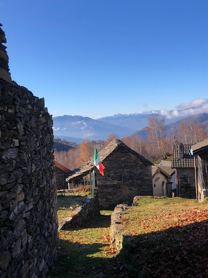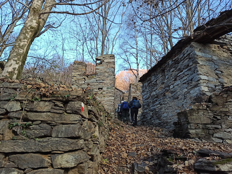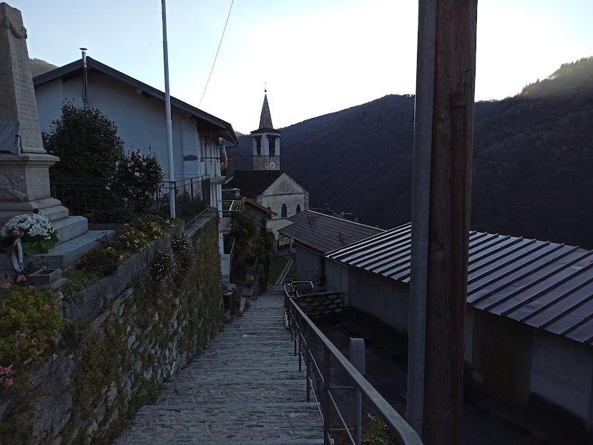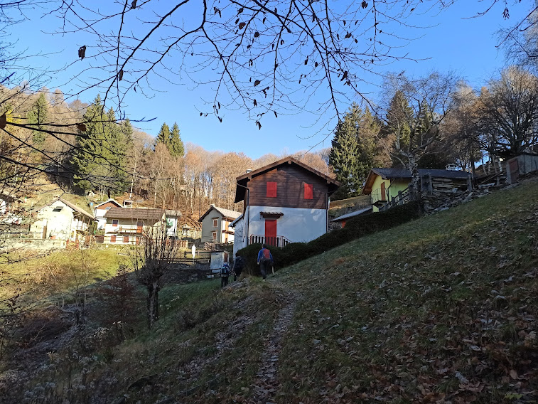 Oggi il sole, contrastato raramente da qualche nuvoletta dispettosa, renderà sopportabile l’aria frizzante che ci fa parlare di “primo freddo”. Saliamo attraverso il paese, tenendoci sulla destra, e seguiamo il sentiero che, più in alto, a quota 880, attraversa la strada asfaltata per Segletta e Piancavallo.