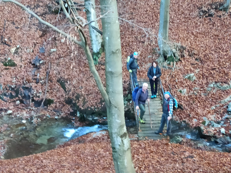 Quasi di comune accordo, si decide di prolungare il percorso, non ripassando da Colle, ma scendendo a Pian d’Arla, 1307, in direzione sud ovest con percorso libero, fra prati e felci fortunatamente non rigogliose ( tre quarti d’ora). Pranziamo al fresco alla stazione di monte della zipline. Seguendo il sentiero evidente riprendiamo la discesa, passando dall’Alpe Scarnasca ed attraversando una proprietà privata che si trova lungo il percorso per evitare l’errore della settimana scorsa. Si attraversa una bellissima faggeta, si scende ad attraversare il torrente su un piccolo, bellissimo ponte romano e si risale a Corte Laveggio, 1037, che fa parte dell’alpeggio di Calpera (un’ora).
