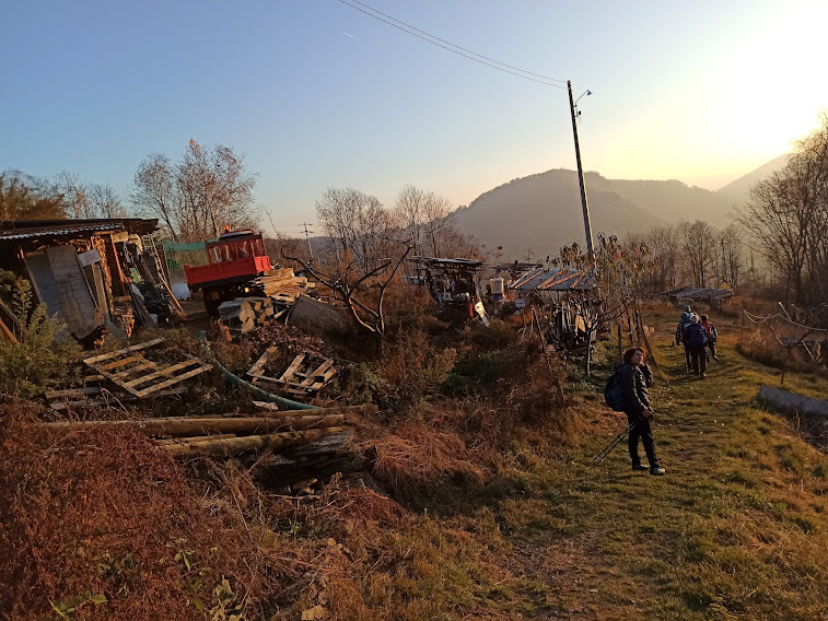 Dopo un buon caffè nella baita della nostra badante riprendiamo la discesa e, a Corte Sotto di Calpera, 1025, imbocchiamo il sentiero più diretto per Aurano, sulla destra, che scende decisamente. Attraversiamo sul ponticello romano il torrente e proseguiamo, quasi in piano, fino ad incrociare a Corte Giovanoli la strada che sale a Segletta. Attraversiamo, costeggiamo l’area “poco svizzera” a lato del sentiero e, dopo un’ora, siamo al parcheggio di Aurano, sul far della sera.