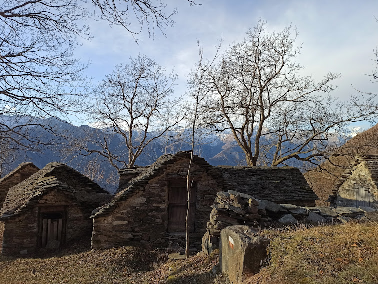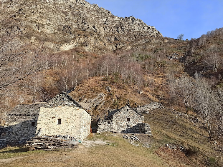 Con saggezza torniamo a La Colla e mettiamo qualcosa sotto i denti. La seconda idea malsana della guida odierna è quella di scendere dalla parte opposta rispetto alla salita, all’Alpe Lut, verso il vallone che sale alla Colma di Premosello. Siamo in ombra su un prato e poi nel bosco. E’ tutto molto ripido e il terreno è gelato.