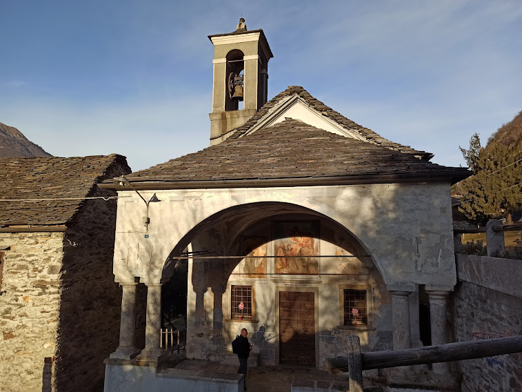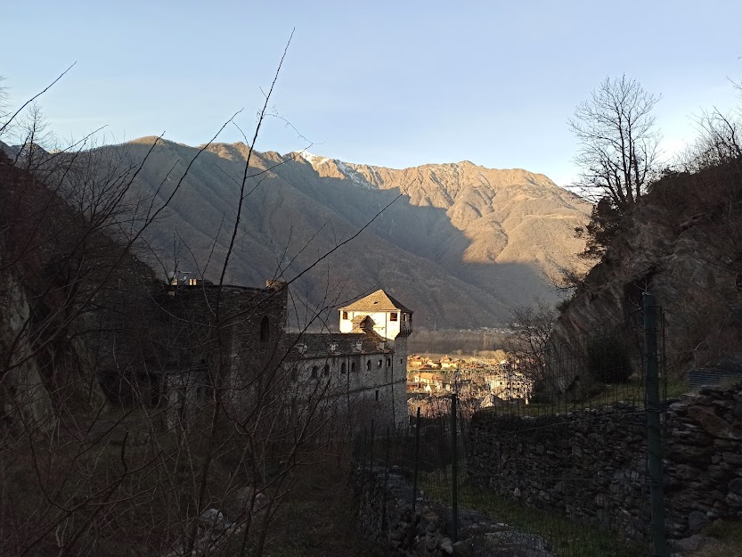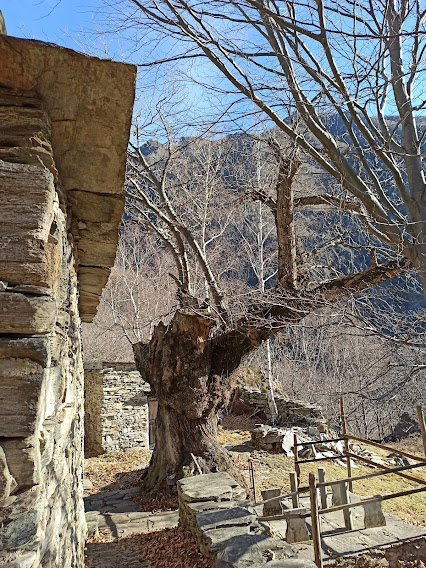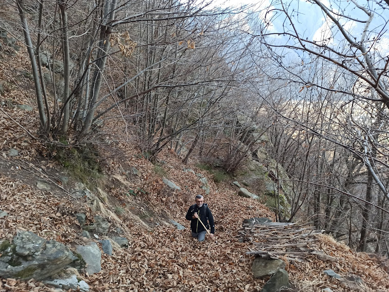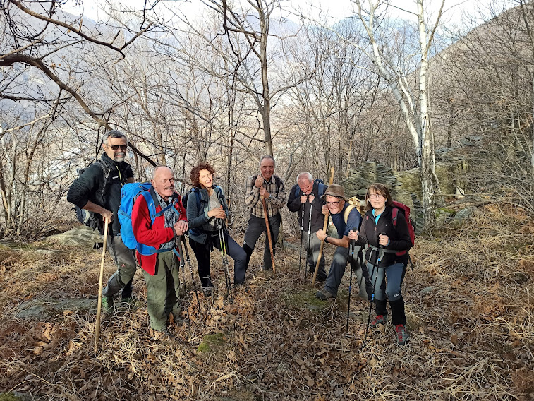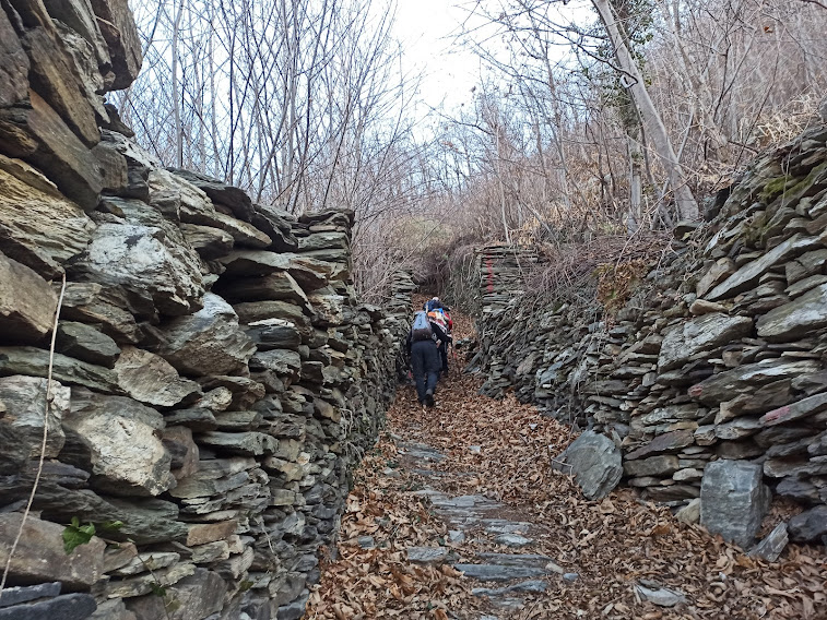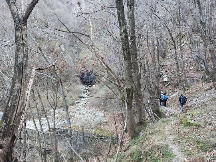 La nostra badante titolare oggi è aiutata da un’altra forte signora ad accudire sette anziani ritirati dal lavoro. Fra loro un esordiente ed un ex maestro di sci taroccato, oltre al medico di turno. Giornata bella e mite, ormai una regola preoccupante per il nord ovest. Parcheggiamo nell’ampio piazzale di fronte a Barone Sport, quota 215. Passeggiamo per Vogogna come un gruppo di turisti d’oltralpe fino al ponte sul Rio delle Chiese, aldilà del quale iniziamo a salire fra le mura del Castello Visconteo, alla nostra destra, e il rio. Poco sopra torniamo sulla destra orografica e percorriamo la bella e ripida mulattiera che ci porta a Genestredo, frazione alta di Vogogna, 362.