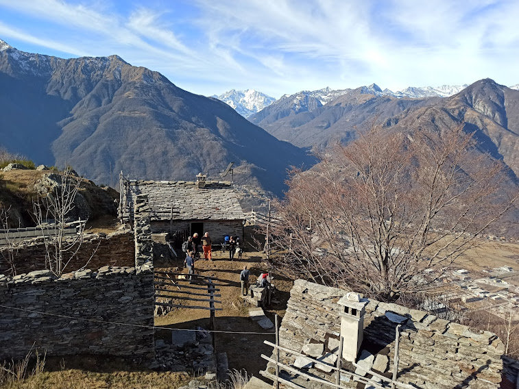 E’ quasi incredibile sbucare da un terreno impervio e piuttosto brutto, in tutti i sensi, in questo angolo di paradiso pulito, ordinato e con un panorama superbo, nonostante la bassa quota. Si spazia sull’intera Ossola con il Monte Rosa in tutta la sua maestosità. Lunga pausa contemplativa e chiacchierata con i proprietari di una bella baita.