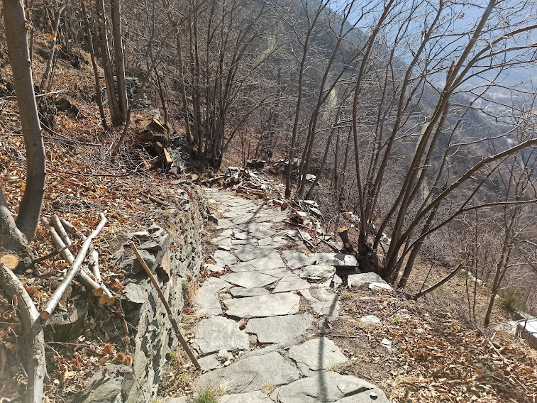 In un tratto pianeggiante incrociamo un sentierino che sale a destra, ma noi proseguiamo diritti. Dopo due stretti tornanti ed una cappella votiva a quota 450 c’è un altra breve salita e poi scendiamo ad attraversare il Rio Dresio, asciutto, in corrispondenza di una briglia. Camminiamo da tre quarti d’ora. Sul versante di destra orografica la mulattiera abbastanza evidente s’inerpica decisamente con tornanti nel bosco.