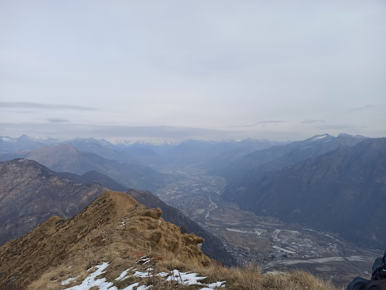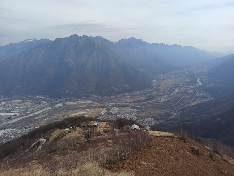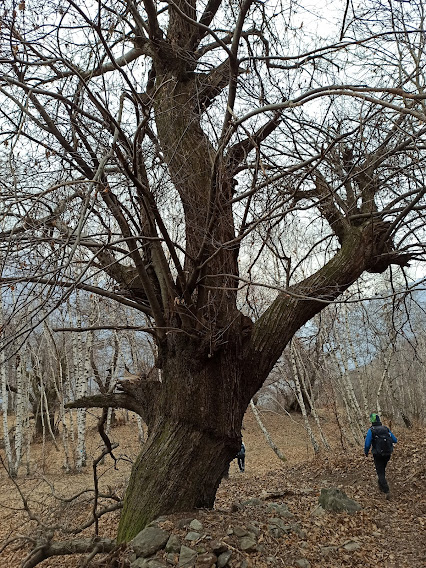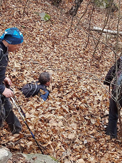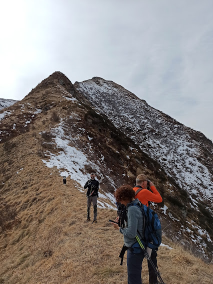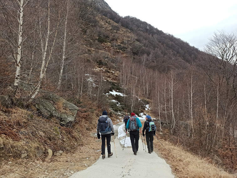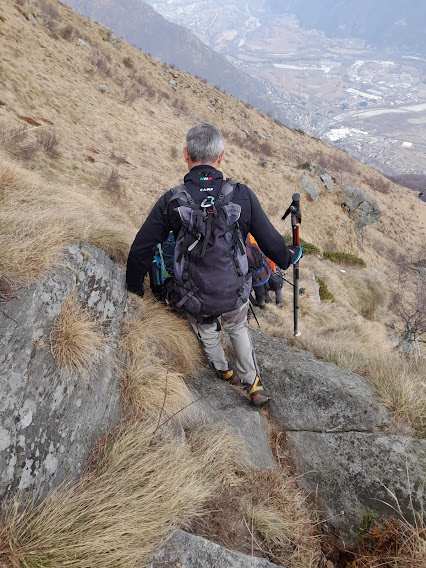 Nessuno può prevedere che un anziano ex alpinista acciaccato e poco allenato sia oggi in trance agonistica e parta in testa al gruppo senza più voltarsi e senza fermarsi neppure alla meta finale prescelta. Questo vizietto l’ha sempre avuto, ma con l’età è peggiorato. Lo seguiamo a distanza di sicurezza, sebbene poco convinti, lungo il sentiero che diventa subito un’esile traccia fra erboni ingialliti dalla siccità e scivolosi, su un pendio molto ripido. Il terreno è anche un po’ gelato, con un misto di neve e fango ancora più scivolosi.