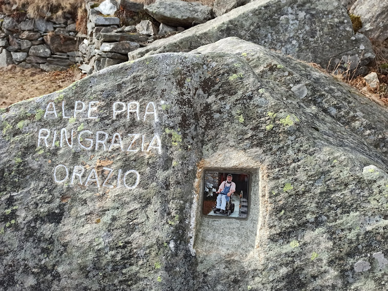 Scendiamo per qualche decina di metri lungo la strada ed imbocchiamo sulla destra il sentiero evidente e ben segnato nel bosco di faggi. Passiamo dall’Alpe La Villa, 756, dall’Alpe Jacheggi, 872, dall’Alpe Gabattina, 888, e, dopo un’ora e tre quarti, arriviamo all’Alpe Prà, 1270. In questo bellissimo alpeggio, raggiunto adesso da una strada, tutto ricorda Orazio Bargiga che per più di trent’anni, insieme alla moglie Maria Grazia, visse qui da aprile ad ottobre sulla sua sedia a rotelle, lasciando un’impronta indelebile con il suo amore per la vita.