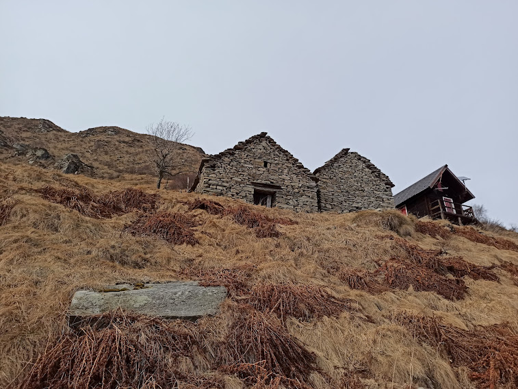 Con l'aiuto di amici, grandi persone, si costruì la casa ed anche un bivacco aperto a tutti gli escursionisti di passaggio, di cui ci serviremo al ritorno. Questo grande signore ci ha lasciati nel giugno di quattro anni fa. Dopo una lunga pausa di ristoro, in contemplazione dei bei panorami sull’Ossola, ripartiamo verso l’Alpe Ghiaccio, 1490, dove dovrebbe terminare l’escursione odierna.
