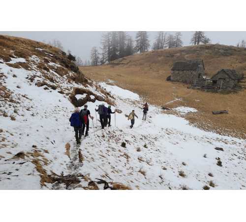 Con la consueta pazienza la forte badante porta a spasso sette anziani lungo i sentieri della Colmine di Crevoladossola. La giornata inizia un’ora prima per lo scrivente e per uno dei nostri medici di turno che è anche il progettista dell’escursione odierna. Portiamo un’auto in località Montaiou, presso l’Alpe Baratta, a quota 1300 circa. Siamo sulla strada che da Varzo sale all’Alpe Solcio passando da Coggia e Dreuza. Con la seconda auto scendiamo al bar Gufo’s, in frazione Pontetto di Montecrestese, per l’appuntamento con i verbanesi. Non è finita! Risaliamo, questa volta sulla strada verso l’Alpe Gorta, sotto la Colmine, e parcheggiamo alla palestra di roccia La Valletta, quota 760. I due autisti sono già quasi stanchi e all’arrivo sarà la stessa storia. Nuvoloso, ma asciutto, ahimè!. Non vedremo uno sprazzo di sole né una goccia di pioggia per tutto il giorno. Lungo la strada asfaltata arriviamo alla Cappella di Puzöi, 798. Seguiamo ancora la strada per un breve tratto ed imbocchiamo il sentiero A09 evidente sulla sinistra. Alle baite di Ceva di Sotto, 980, la prima breve pausa. A Ceva di Sopra, 1050, torniamo sulla strada, ma l’abbandoniamo quasi subito tenendoci a destra per una breve variante consigliata da un profondo conoscitore della zona. Infatti, allungando di poco il percorso, si prospetta la grande occasione di incontrare dei camosci che spesso soggiornano dalle parti dell’Alpe Ginestrin. Dopo una bella baita, direi villa, un ripido e breve canalino, dove si trovano delle cordine utili in caso di neve o ghiaccio, immette in una radura dove non c’è traccia degli ungulati previsti. Ritroviamo la strada, in questo tratto molto ripida, a quota 1100 e la seguiamo fino alle prime baite di Gorta, 1300, e a quelle più alte, 1330. Lasciamo la strada che sale all’Alpe La Prasca e torniamo sul sentiero A09 per un tratto pianeggiante, con baratro sulla sinistra, che conduce ad un breve strappo e ad un’incantevole valletta. Alla nostra destra c’è il sentiero che sale all'Alpe La Prasca. Noi saliamo a sinistra alla Colmine, 1702, che raggiungiamo dopo due ore e venti minuti dalla partenza, soste escluse. Non c’è più l’albero colpito dal fulmine con un grande buco alla base che formava una suggestiva cornice in cui ci si faceva fotografare con la piana dell’Ossola come sfondo. Presso il Bivacco Colmine, dedicato all’Alpino Protti Andrea, ci meritiamo una breve pausa. Qui, all’Alpe Colmine di Fuori, comincia la lunga e spettacolare dorsale fra Divedro e Antigorio che confluisce verso nord nord ovest nel massiccio del Cistella. C’è un po’ di neve. Passando dall’Alpe Colmine di Dentro, 1648, ci abbassiamo di un centinaio di metri nel fiabesco bosco di abeti, anch’esso colpito dalle tempeste degli anni scorsi. La risalita morbida, con altri brevi saliscendi, ci porta al bivio per l’Alpe Saborsone e Varzo, alla nostra sinistra. Noi proseguiamo diritti, passiamo dalla Croce di Sasso ed arriviamo all’incantevole Alpe Genuina, 1695, dove pranziamo al freddo, perché oggi del sole non c’è traccia (poco meno di un’ora dalla Colmine). Proseguiamo verso nord, alzandoci subito di qualche decina di metri fino al punto più alto dell’escursione. Di qui si scenderà soltanto, con una certa attenzione perché c’è un po’ di neve, a tratti, ma mai più di una ventina di centimetri. Dopo tre quarti d’ora siamo al Passo della Colmine, 1605. Diritti si proseguirebbe per l’Alpe Solcio, ma noi scendiamo a sinistra sul sentiero sempre evidente e senza più neve. A quota 1480 teniamo la destra verso Dreuza – Varzo, lasciando quella che è anche una pista per ciclisti acrobatici. Troviamo i primi faggi e alle subdole pigne si sostituiscono le ancor più subdole foglie. In meno di tre quarti d’ora siamo all’auto parcheggiata al mattino a quota 1300. Dopo quasi un’ora torniamo a recuperare gli altri che, nel frattempo, sono arrivati a piedi a Coggia, 820, dopo sedici chilometri di cammino.
