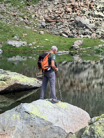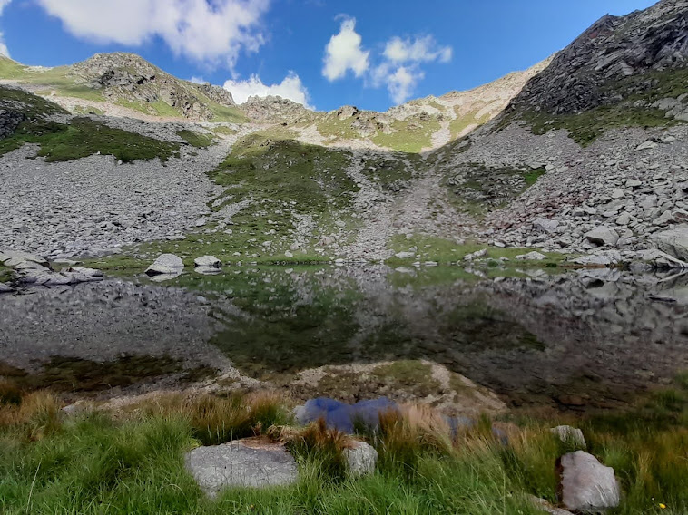 Attraversiamo delle pietraie, in dolce salita salvo un breve strappo, con andatura tranquilla dettata dall’anziano debilitato dai postumi del Covid e, in un’ora, siamo allo splendido laghetto di Oriaccia, 2128. Dopo la meritata pausa colazione abbandoniamo il sentiero D14, che sale al Passo di Oriaccia, verso la Svizzera, e viriamo a sud in direzione dell’Alpe Il Laghetto.