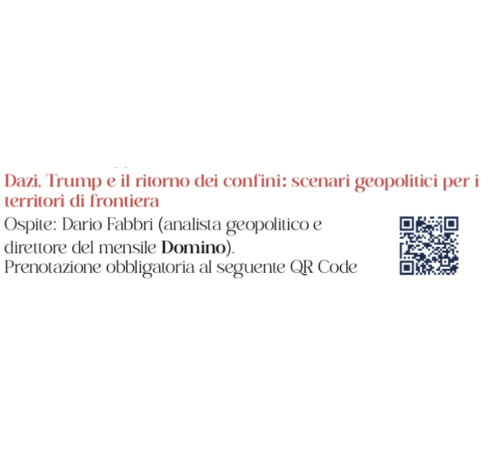 Il tema è di stretta attualità: quali possono essere le conseguenze, per l’economia di un territorio di confine come il nostro, dei nuovi dazi introdotti dal presidente Usa Donald Trump? Fabbri offrirà al pubblico le risposte a questa e a molte altre domande, analizzando la situazione da un punto di vista geopolitico. La partecipazione all’incontro è gratuita. È però obbligatoria la prenotazione, da effettuare inquadrando il Qr code qui sotto.