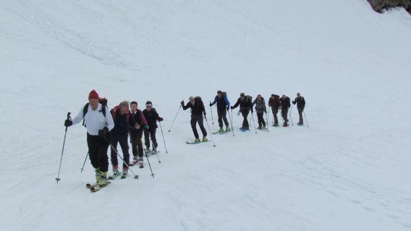 Per motivi diversi qualcuno si accontenta di raggiungere l'inizio del ripido pendio che porta alla bocchetta e si gode il sole, la mancanza di vento, rara in queste zone, ed il piacevole tepore a quota 2300. In quattro proseguiamo con tutta calma, sfioriamo una grande slavina vecchia di qualche giorno sulla nostra sinistra ed imbocchiamo la bella traccia segnata che ora sale decisamente. Dopo i primi dietro-front, visto che siamo in totale relax e non in gara, concordiamo tutti sulla comodità di inserire i rampant, prima di trovarci in posizione troppo scomoda per tale operazione. Solo Asia, con la sua trazione integrale, non ha bisogno di aiuti tecnologici e morde il freno.