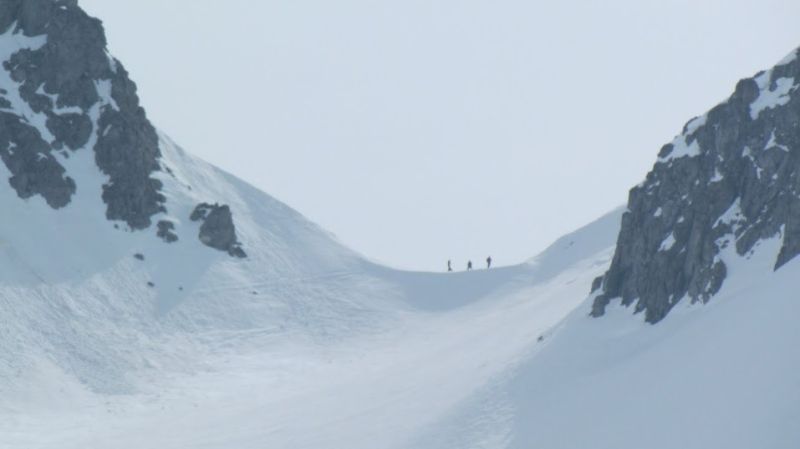 La salita è ripida, ma la pendenza, costante grazie al tracciatore della pista, consente un passo tranquillo e in poco più di due ore siamo alla Bocchetta del Castel o Kastellücke, 2714. Mentre ci riassettiamo per la discesa un folto gruppo di sciatori tedeschi arriva dalla vetta del Basodino e si familiarizza subito, come sempre a queste quote. Hanno pernottato al Maria Luisa e ci danno immediatamente l'impressione di essere esperti, allenati e ben informati sulle bellissime salite del nostro territorio. La neve resta compatta e ci godiamo una splendida discesa. Ci ricongiungiamo a tutti gli altri in prossimità di un baitone isolato a quota 2250 circa. Mentre pranziamo al sole, sempre più pallido, osserviamo in lontananza, profondamente ammirati, un gruppo di sciatori che scende il canale parallelo e a sud di quello appena disceso da noi, ma molto più stretto e ripido.