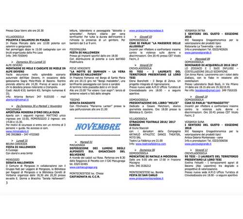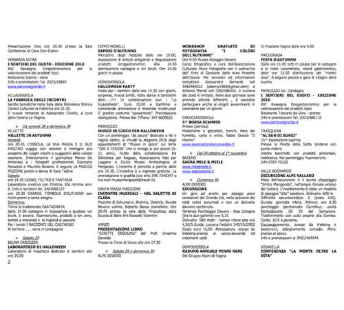 DOMODOSSOLA-27-10-2016- Grazie all'Ufficio Iat della Pro Loco di Domodossola ecco a voi, qui sotto, tutte le manifestazioni presenti in Ossola nel prossimo lungo fine settimana, dalla Sagra Melemiele alle varie feste di Halloween. Buon divertimento!