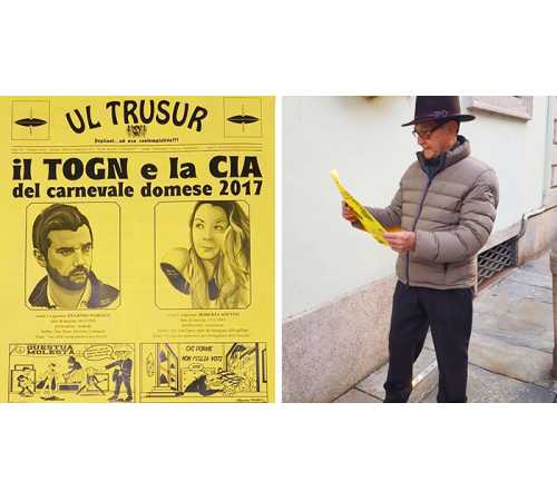 E' infatti incominciata la distribuzione gratuita, nelle edicole e nei 'ciapasù' di ossola24.it in giro per la città de "Ul TRusur", il foglio satirico del Comitato Polenta e Sciriuii dove potrete trovare, insieme alle vignette ed alla presentazione delle maschere domesi, il Togn e la Cia, anche il ricco programma di eventi del carnevale domese 2017 che inizierà sabato con tante novità. In programma infatti la nuova cerimonia di consegna delle chiavi della città alle maschere, dalle ore 16, 30 ci sarà la sfilata da piazza stazione per le vie centrali sino in piazza Mercato della Corte di Mattarela, dei notabili del Carnevale, del Togn e Cia, del Civico corpo musicale domese e del Comitato Carnevale di Villadossola. Alle 17 in piazza Mercato, sul palco, ci sarà la consegna delle chiavi con l'assaggio della polenta offerta dal Comitato, poi l'esibizione del Gruppo Sbandieratori e musici di San Damiano D'Asti. Alle 19 l'apericena ai bar Acosta e Osteria, serata dalle 23 al Bar Boss col "Carnoval Circus, con lo spettacolo di giocolieri e buttafuoco. Nel frattempo Domo si è tinta di giallo, con le tante bandierine appese per le vie e le vetrine dei negozianti abbellite con il "kit" predisposto dal Comitato ed i disegni dei bambini delle scuole elementari.