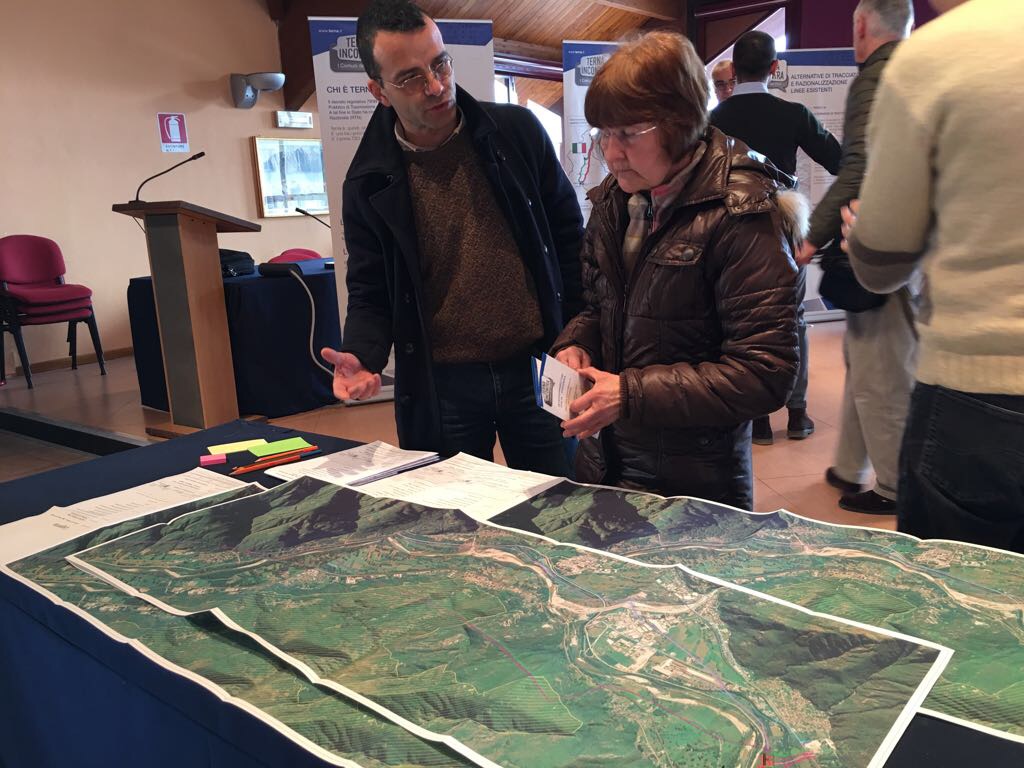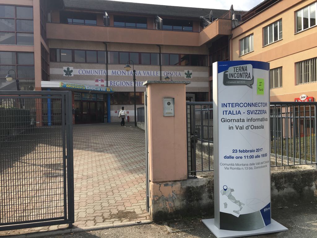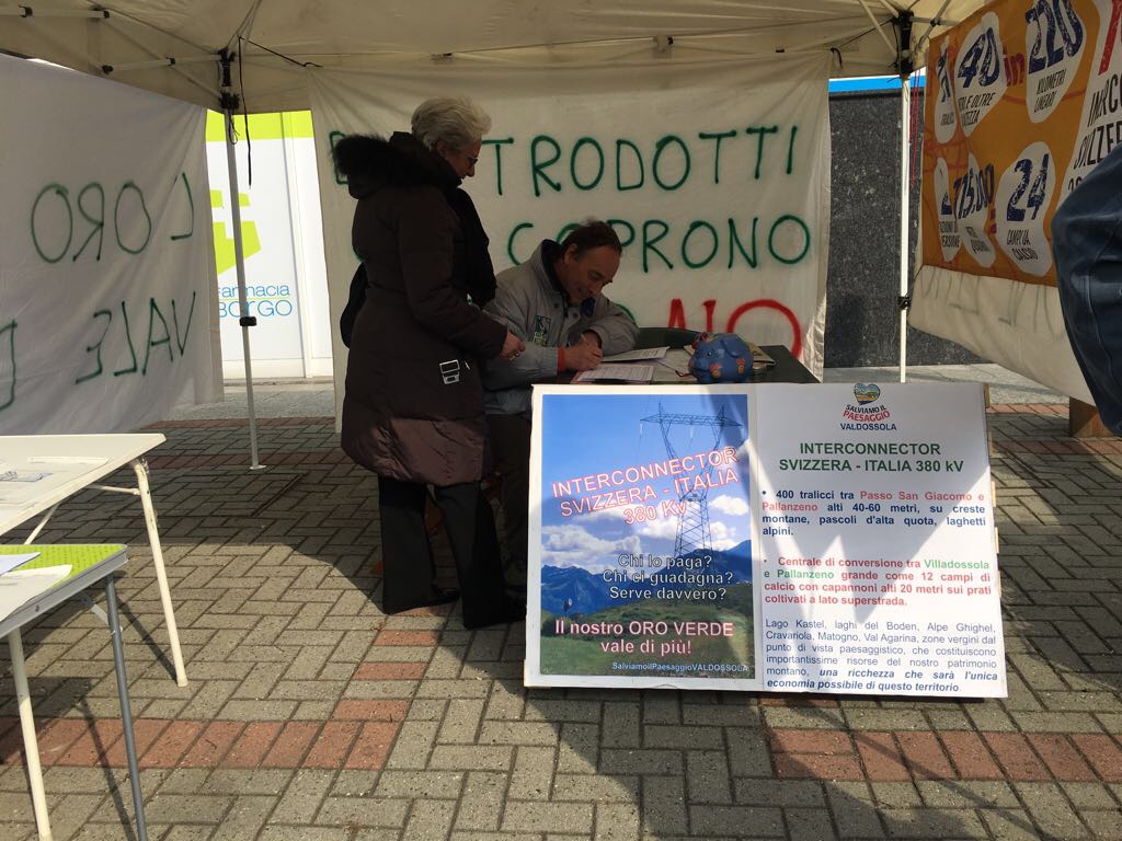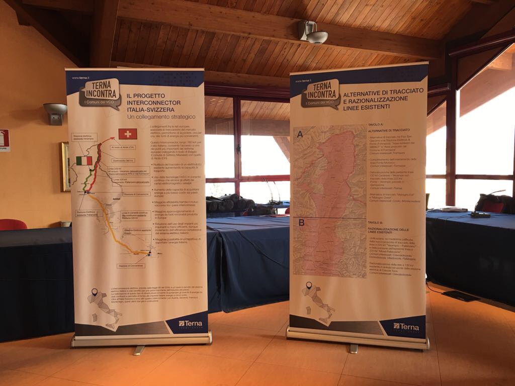 e manifestanti all'esterno, presso la sede domese dell'ex Comunità Montana Valle Ossola, organizzato da Terna dopo quello di ieri in Formazza, per presentare agli interessati i progetti per la centrale di riconversione prevista tra Vogogna e Pallanzeno del progetto Interconnector, che dovrebbe portare energia elettrica attraverso una nuova linea tra le due parti delle Alpi: “Sono qui a manifestare per ricordare agli abitanti dell'Ossola che non sono cittadini di serie B- spiega Gianfranco Mazzocco del Comitato Monte- in altre parti d'Italia, penso in val Chiavenna, in va di Susa, nel Trentino, vengono utilizzate le tecnologie d'interramento, che potrebbe essere usata anche qui. Ovviamente costa di più, si vede che non si vogliono far spendere questi soldi agli investitori”. “Abbiamo voluto portare all'attenzione della cittadinanza- così Raffaele Fiorentino di Terna- il nostro progetto di connessione con la Svizzera che sarà interamente finanziato da investitori privati. L'abbiamo realizzato il più compatibile per l'ambiente, e fatto tavoli con la Regione tesi a migliorare questo progetto. Siamo ad una finestra per portare all'attenzione dei cittadini il progetto e tutti i lavori alternativi di tracciato identificati con la Regione, quindi chiariamo alcuni problemi che possono essere ritenuti tali, ma che in realtà sono i limiti progettuali complessi. Abbiamo predisposto dei pannelli esplicativi, tra cui quelli sui campi elettromagnetici, il nostro progetto prevede parte in corrente alternata ed altri in continua, è lungo 220 chilometri ed azzererà il campo magnetico percepito come più pericoloso per la salute dei cittadini, quello “variabile”. L'impianto prevede anche due stazioni di conversione al termine dei 100 chilometri di linea a tensione continua. Accogliamo le richieste che siano fattibili tecnicamente”.