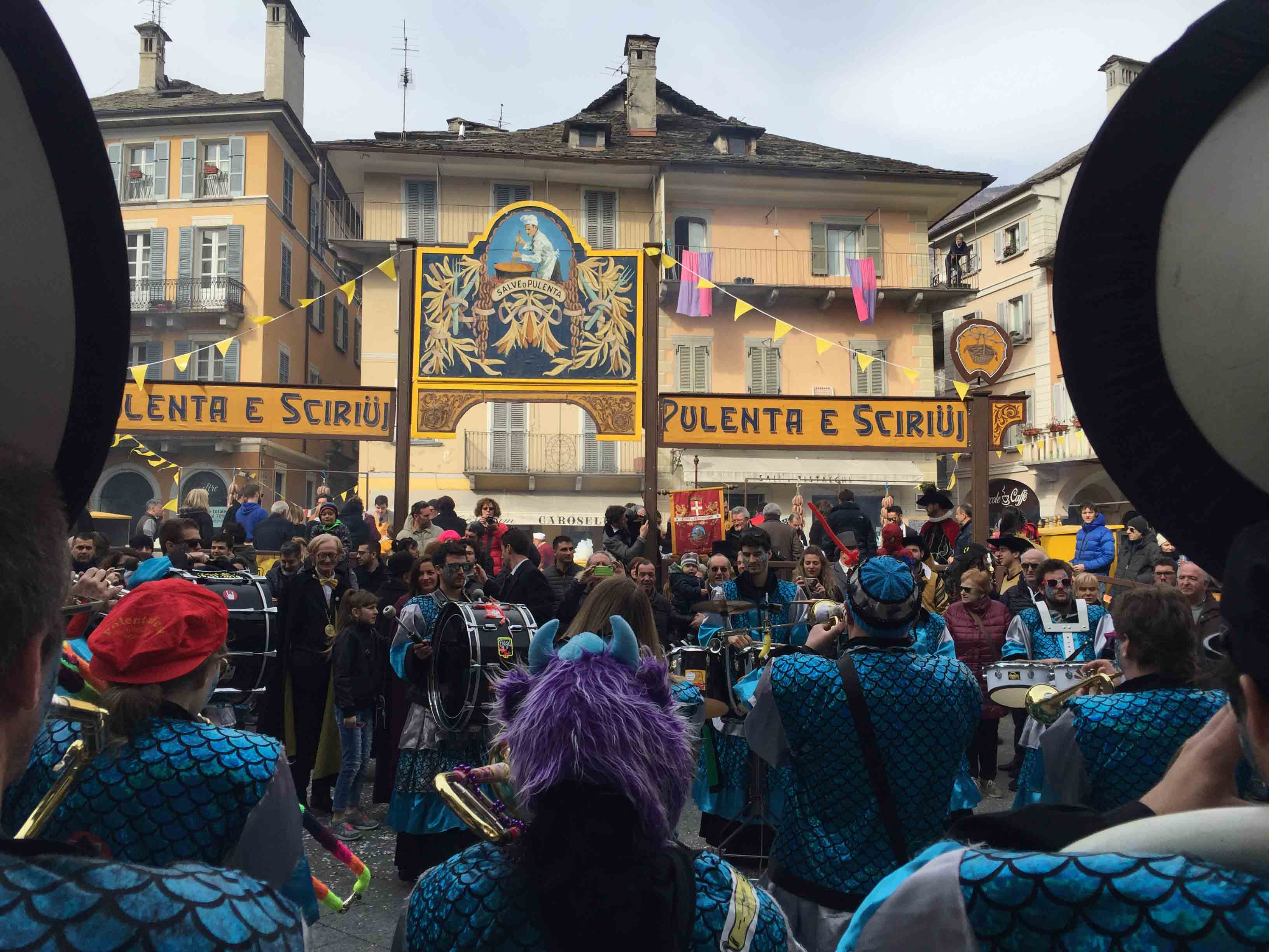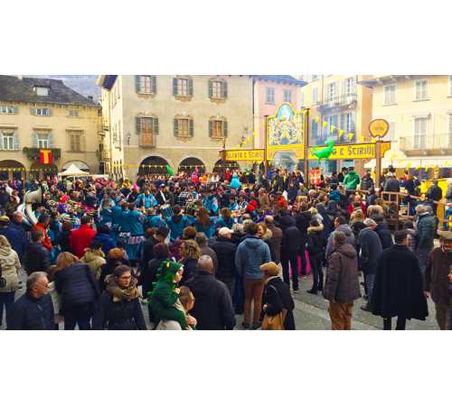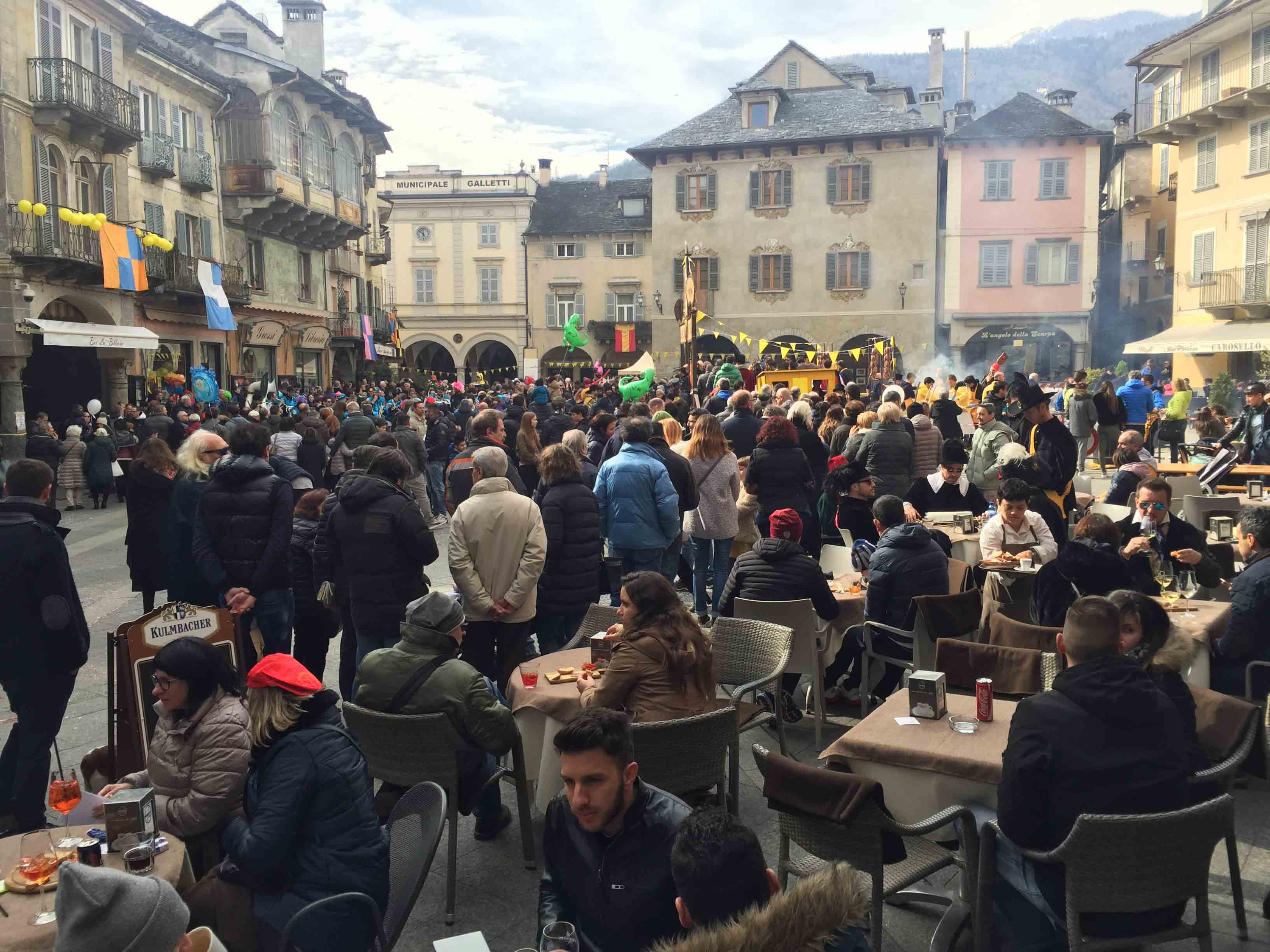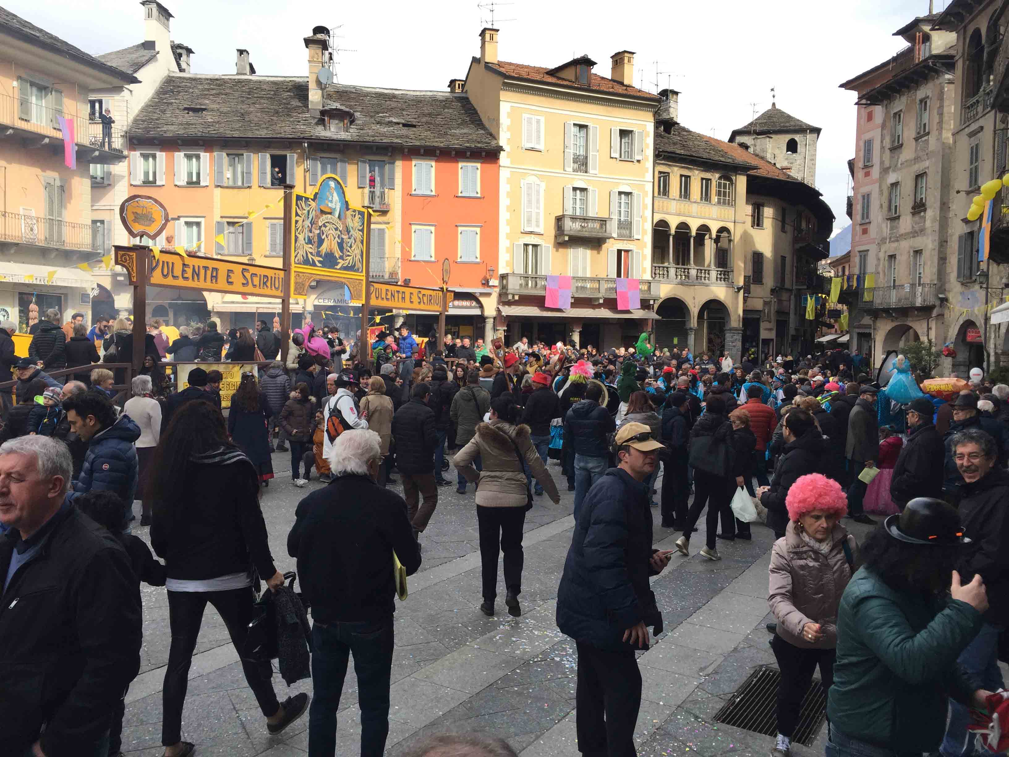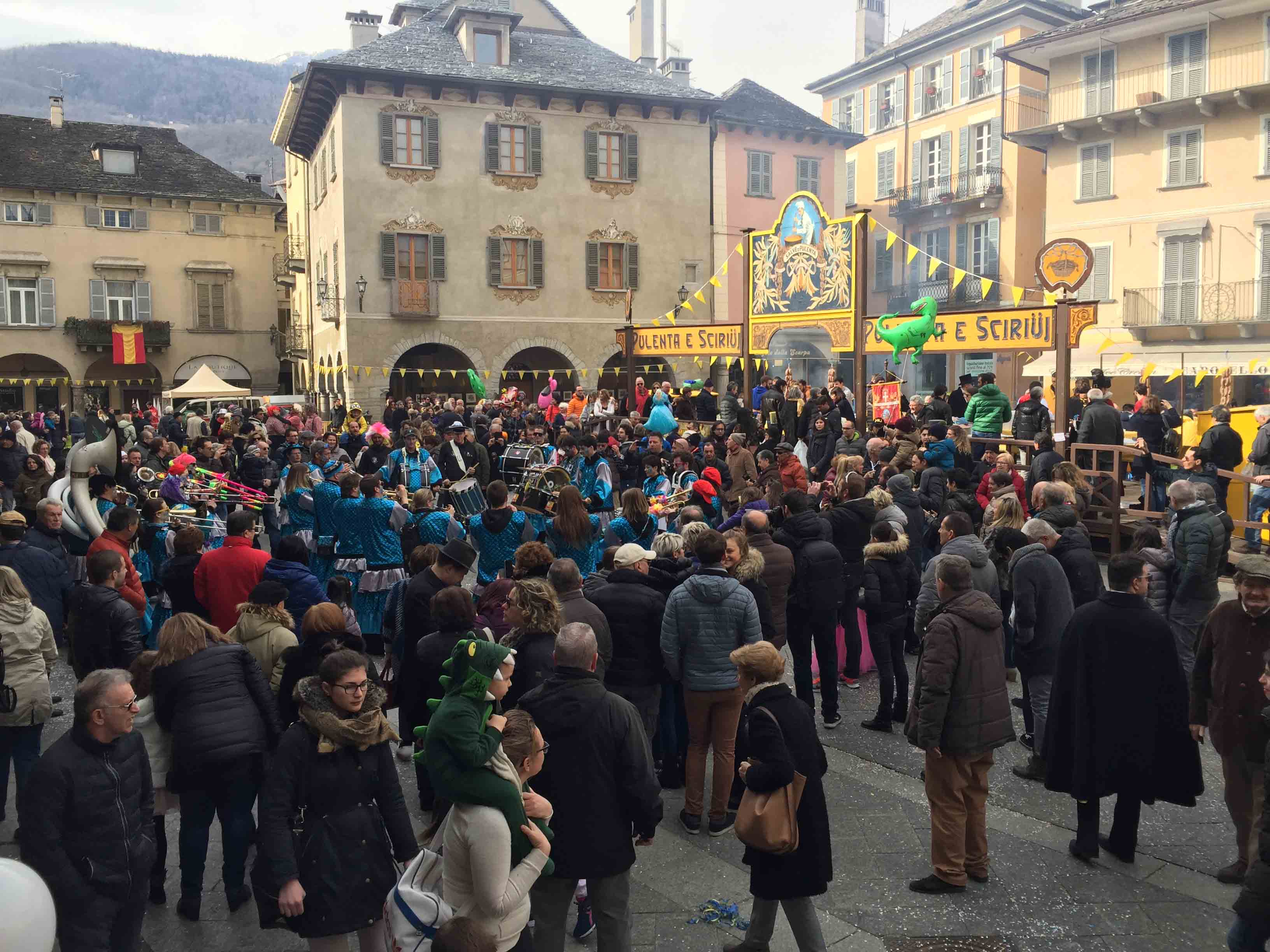 complice la calda giornata di sole, per la tradizionale distribuzione della polenta e salamini di Carnevale. In edicola è uscito il giornale satirico Il Tavan, che col motto, “Pingo ma non pungo” prende in giro i personaggi cittadini. Come da tradizione la Corte di Mattarella ha scortato il Conte e la Contessa di Carnevale, accompagnati da padrino e madrina e membri del Comitato Polenta e Sciriuii sin sotto il palco, dove la Contessa ha “assaggiato” il primo salamino per dare poi il via alla distribuzione. Immancabile la banda di Simplon Dorf, che ha allietato i presenti in coda per ritirare la polenta con le allegre melodie d'oltralpe. Dalle 14 la sfilata ed alle 16 in piazza il matrimonio di Togn e Cia.