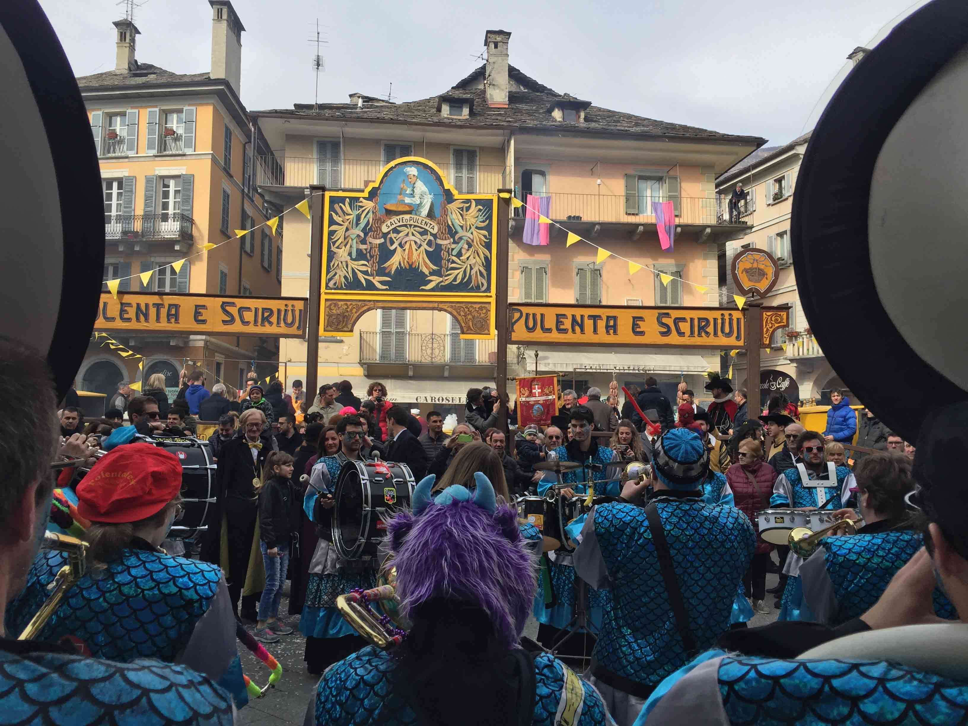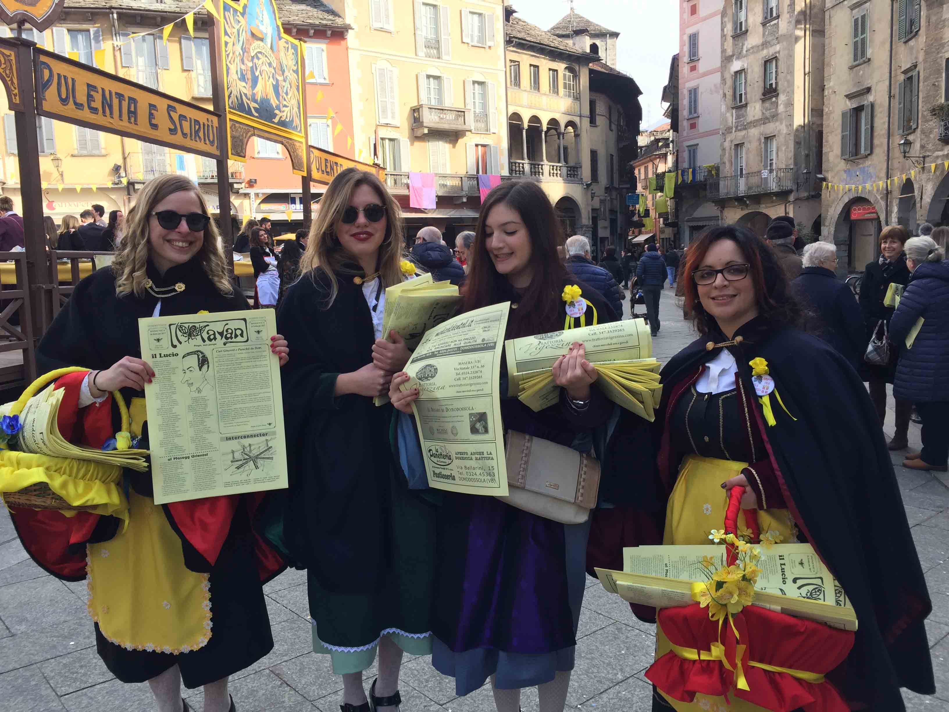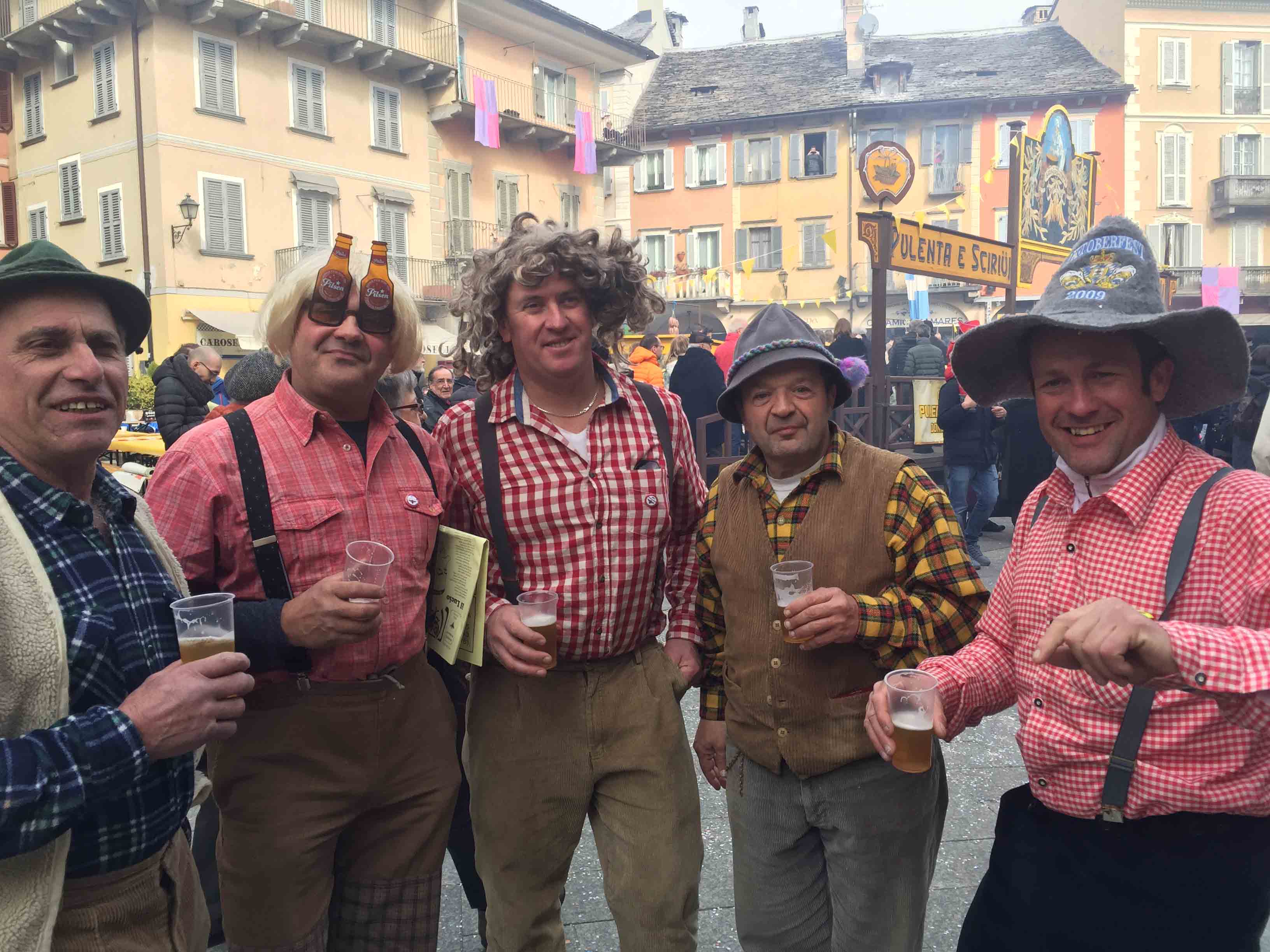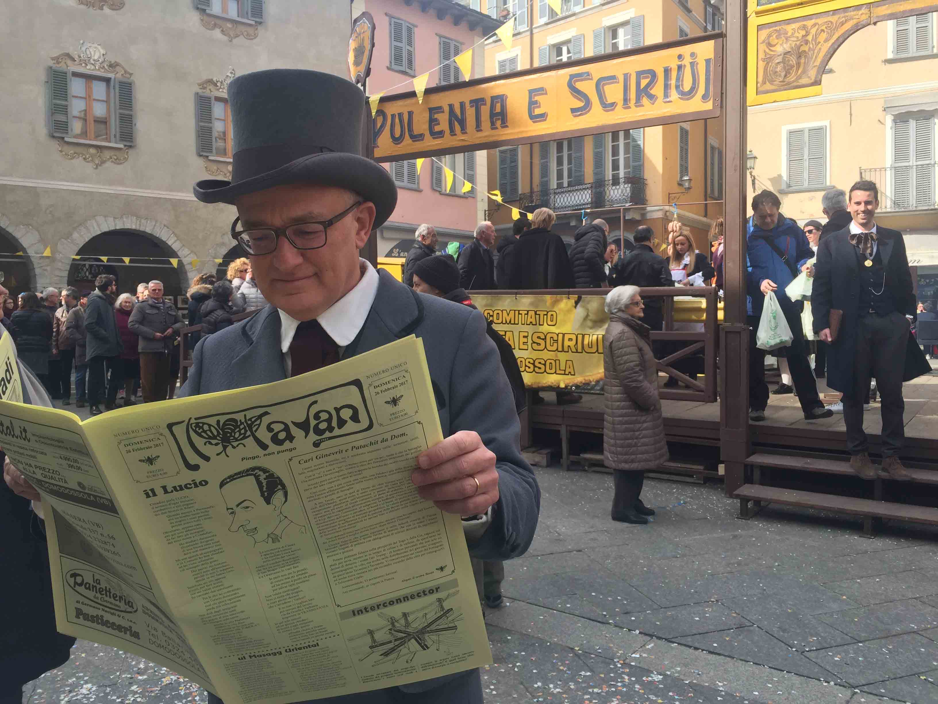 complice la calda giornata di sole, per la tradizionale distribuzione della polenta e salamini di Carnevale. In edicola è uscito il giornale satirico Il Tavan, che col motto, “Pingo ma non pungo” prende in giro i personaggi cittadini. Come da tradizione la Corte di Mattarella ha scortato il Conte e la Contessa di Carnevale, accompagnati da padrino e madrina e membri del Comitato Polenta e Sciriuii sin sotto il palco, dove la Contessa ha “assaggiato” il primo salamino per dare poi il via alla distribuzione. Immancabile la banda di Simplon Dorf, che ha allietato i presenti in coda per ritirare la polenta con le allegre melodie d'oltralpe. Dalle 14 la sfilata ed alle 16 in piazza il matrimonio di Togn e Cia.