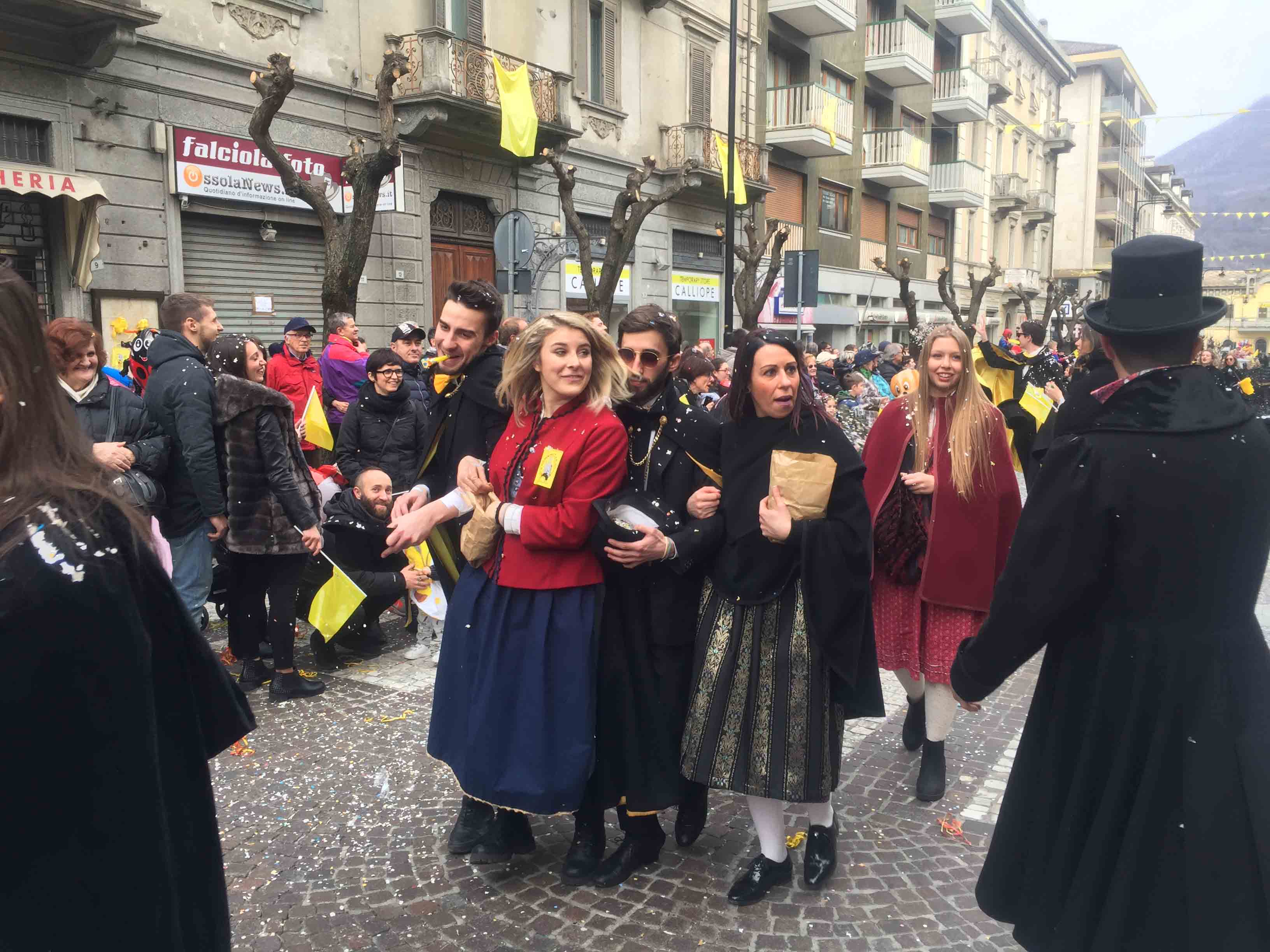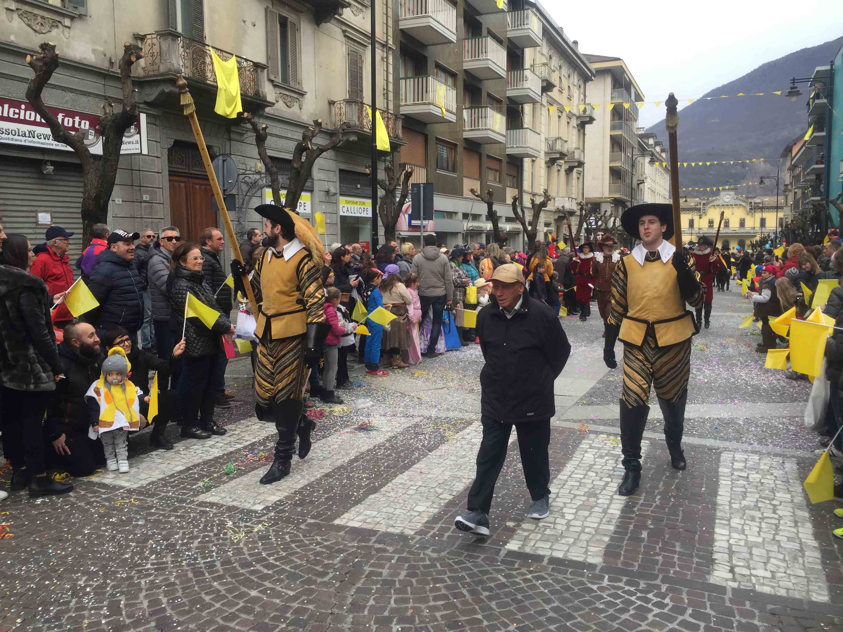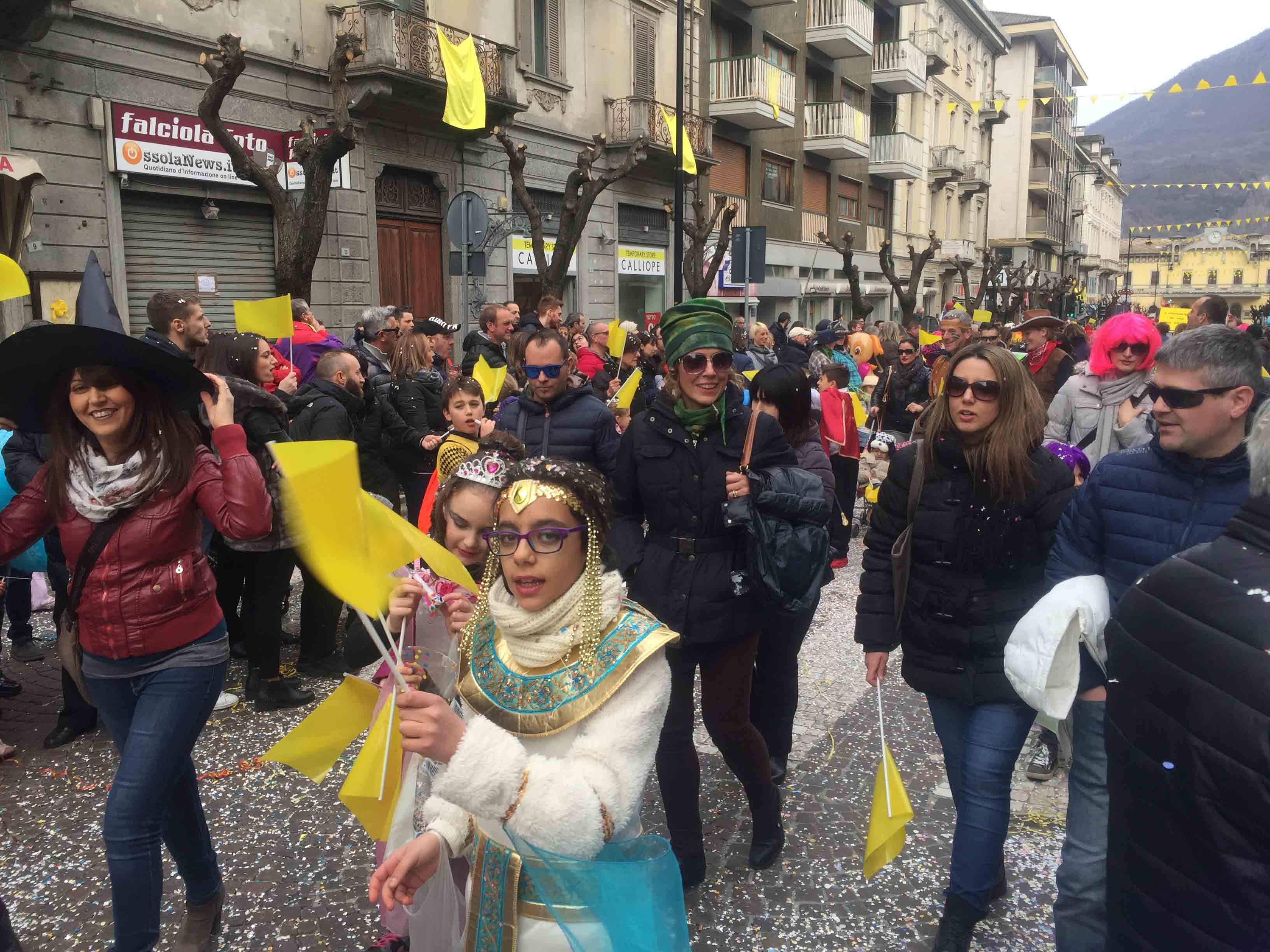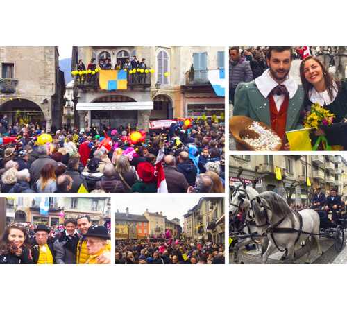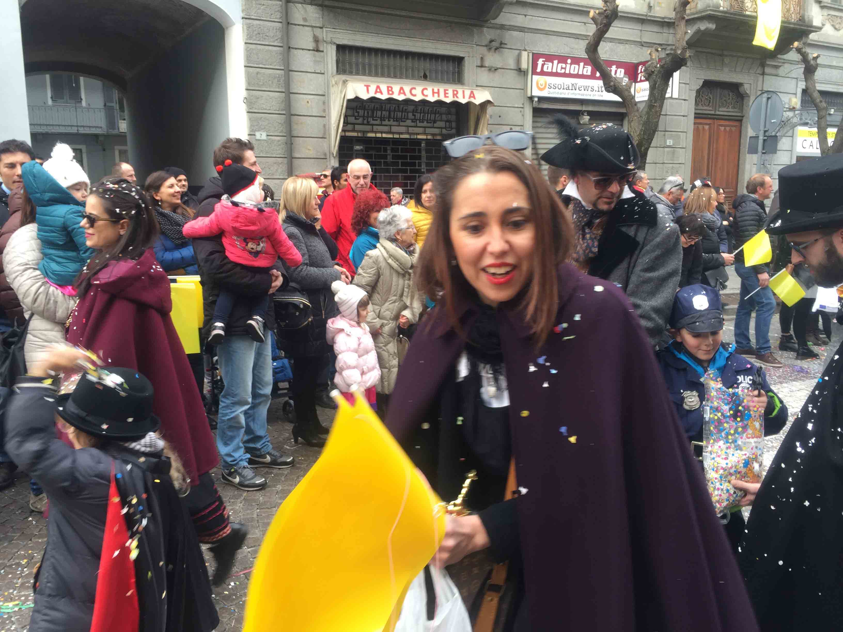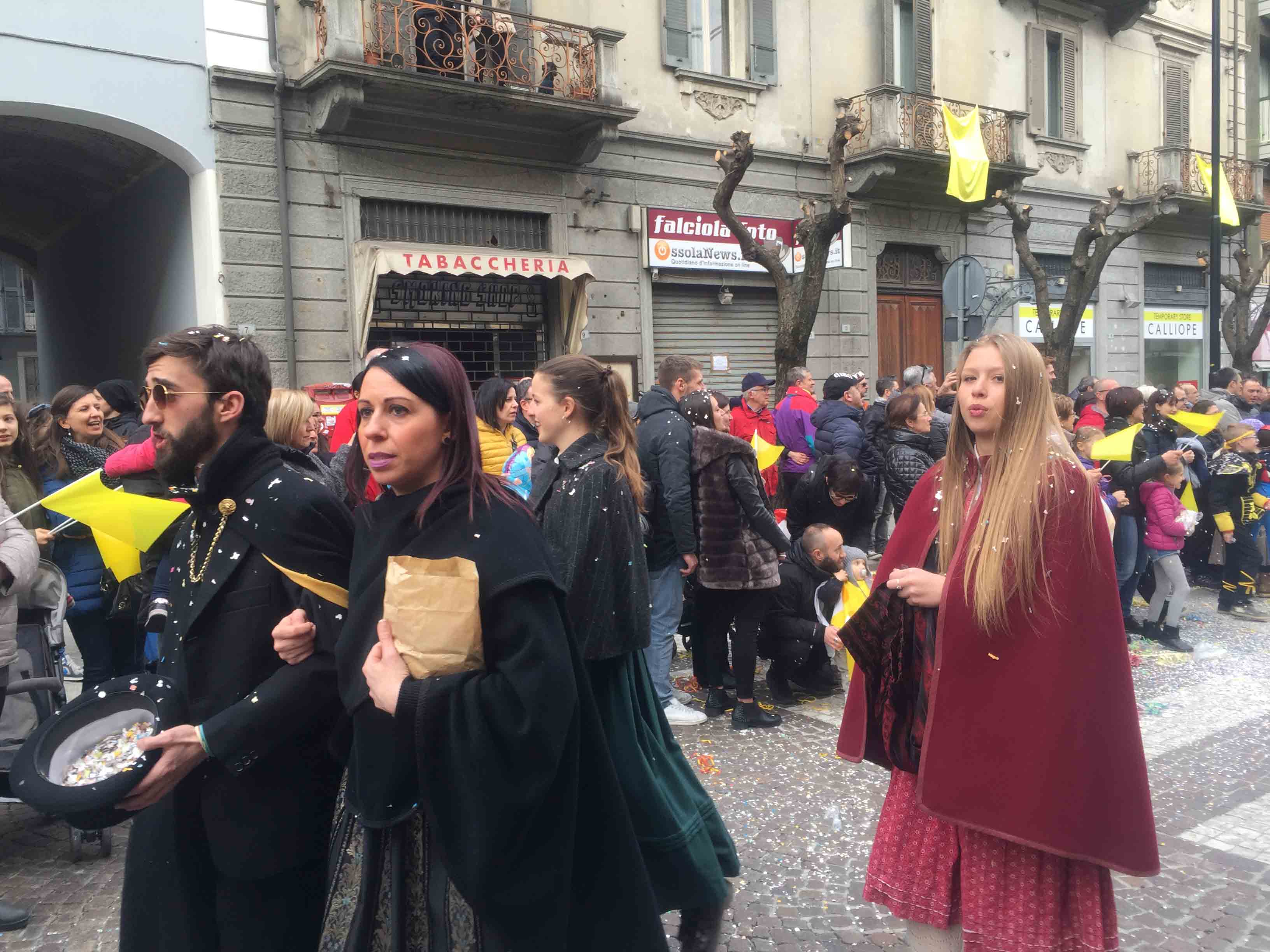 e nelle vie del centro per asistere alal sfilata di carnevale ed al matrimonio di Togn e Cia. Sin dalle ore 14 i marciapiedi sul viale della stazione si sono riempiti di gente, in attesa dell'arrivo dei gruppi folk, dei carri, della Corte di Mattarella, dei notabili del Carnevale domese, delle bande di Domo e Briga e di Togn e Cia, quest'anno su una bellissima carrozza trainata da due cavalli bianchi. La sfilata si è snodata per le vie del centro terminando in una gremitissima piazza Mercato,presente anche il sindaco Lucio Pizzi, dove sono stati applauditi tutti i partecipanti e dove poi, su un balcone di fronte al palco della polenta, si è celebrato il matrimonio tra le due maschere cittadine, Dopo il bacio di rito il discorso del Togn e poi il via con la seconda distribuzione di polenta e salamini, quest'anno da record. Il Carnevale prosegue martedì in piazza.