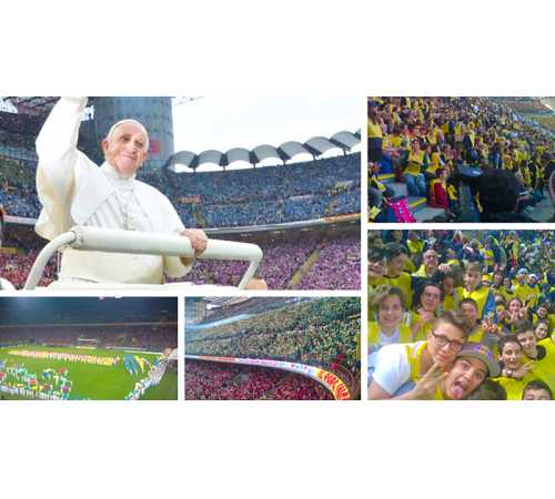 domesi della Statale e del Rosmini più qualche animatore del Liceo Sportivo Marconi-Galletti i presenti allo stadio San Siro di Milano per Papa Francesco: "L'occasione - spiegano i protagonisti- l'incontro con papa Francesco, semplice e toccante il suo discorso, incredibile e scenografica la location per gli 80.000 presenti totali. Baciati da un gran sole, dopo un momento di festa con band giovanili, il cantante Van des Fross e il comico Giacomo del trio Aldo-Giovanni-Giacomo finalmente l'arrivo di Francesco. L'importanza del dialogo con i nonni, il gioco sano, la condivisione e la solidarietà alcune delle tematiche affrontate. "Si arriva alla fede solo partendo dalla realtà, approfondendo seriamente ciò che quotidianamente si vive" ha detto. In serata, il rientro a Domo, nella straordinaria ordinarietà della vita".